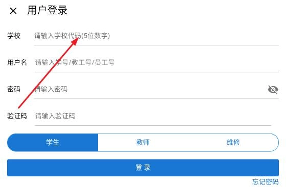 在用户登录界面,可依据身份选择“学习”“教师”“维修”类别进行登录,登录时需填写学习代码、用户名(学号/教工号)以及密码、验证码即可完成登录操作。