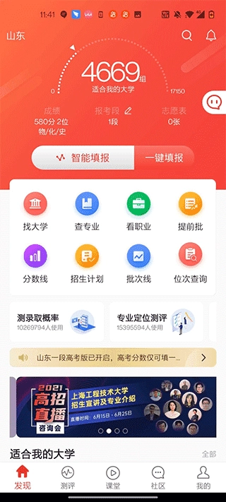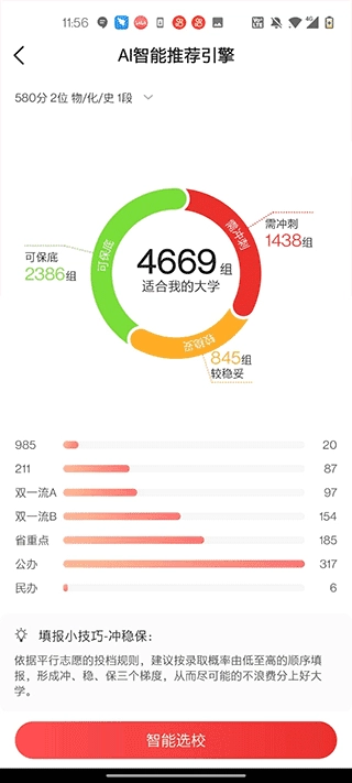 点击【智能匹配】按钮后,系统会根据分数筛选出最适合的高校,为你提供参考。