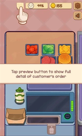 为顾客点餐,仔细聆听他们的需求。通过完成订单获取奖励、积累金币,以此解锁更多食材,丰富你的菜单选项。及时将餐品上桌,在限定时间内精准送达每一份完美订单。