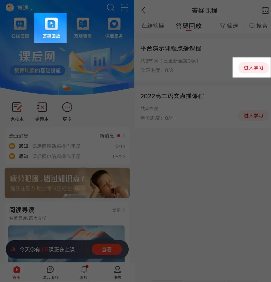 在“首页”顶部的应用区域找到“答疑回放”并点击,跳转至对应页面后,选择你需要的课程,点击“进入学习”按钮。接着,在课程列表里找到相应的课次,点击该课次右侧的播放按钮,就能开始观看了。