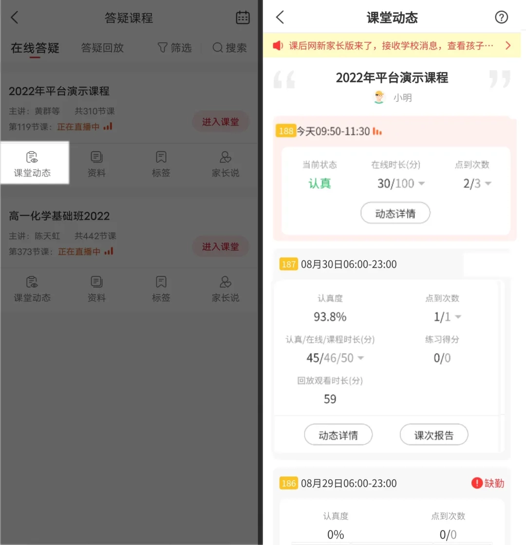 进入答疑课列表界面后,挑选对应的课程并点击“课堂动态”,就能清晰了解孩子的学习情况。