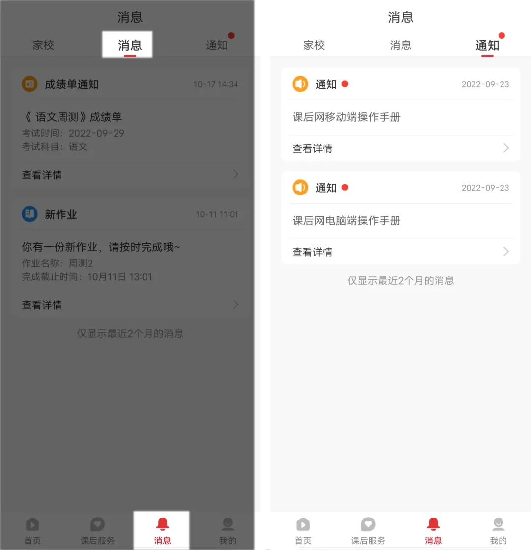 消息中心整合了公告、作业通知、课程通知以及家校聊天功能。点击下方“消息”栏目进入消息界面,点击上方的tab栏切换各个栏目,查看相应的内容。