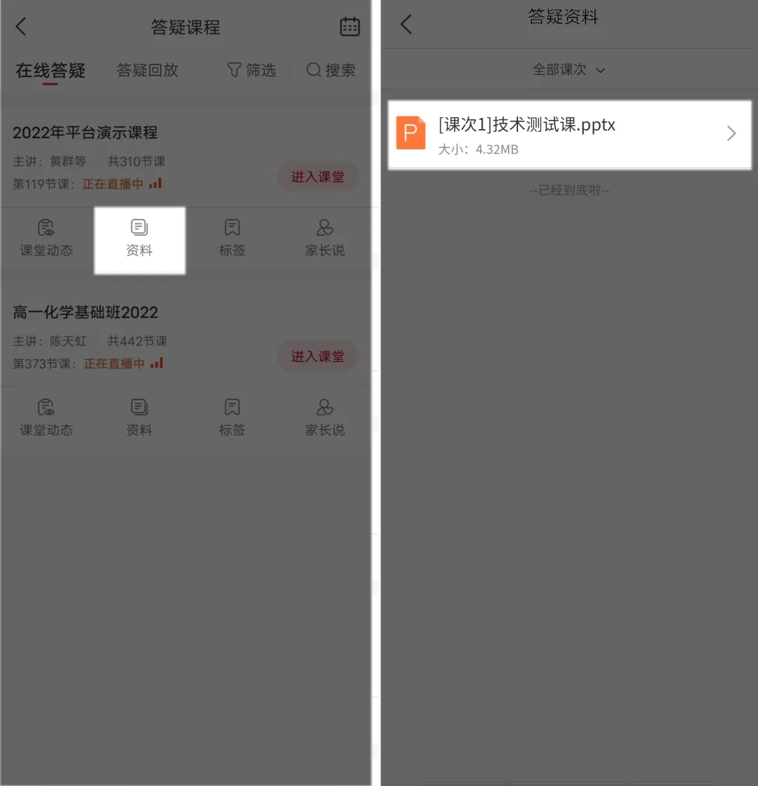 进入直播课界面后,找到对应的课程并点击“资料”选项,就能查看该课程各课次的答疑资料了。