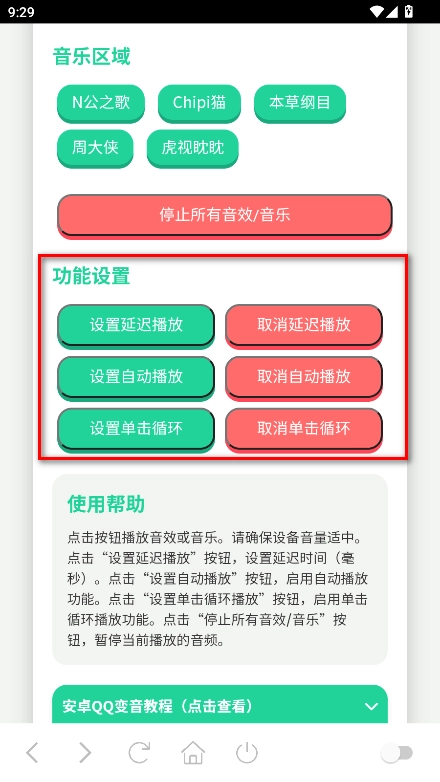 功能设置板块包含了多项功能,主要有最新的设置延迟播放、取消延迟播放、设置自动播放、设置单击循环等。
