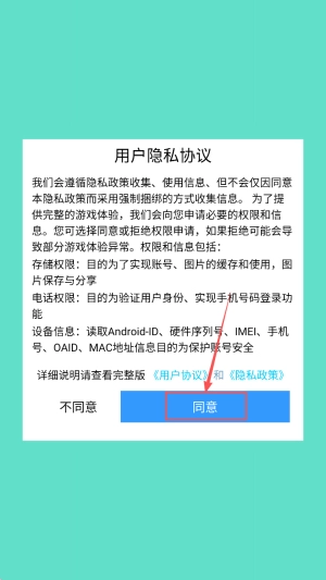 确认协议:首次进入游戏时,点击“同意”按钮,接受用户协议即可继续。