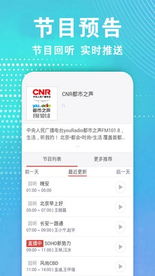 灵活收听,预约回放 支持节目预约与回放收听,方便您依据自身时间安排,随时收听喜爱的节目。