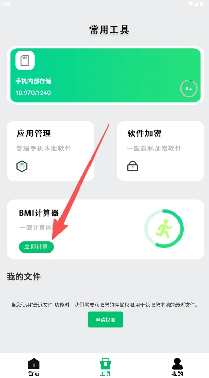 你可以在工具页面里找到“BMI计算器”这个模块,然后点击模块上的“立即计算”按钮。