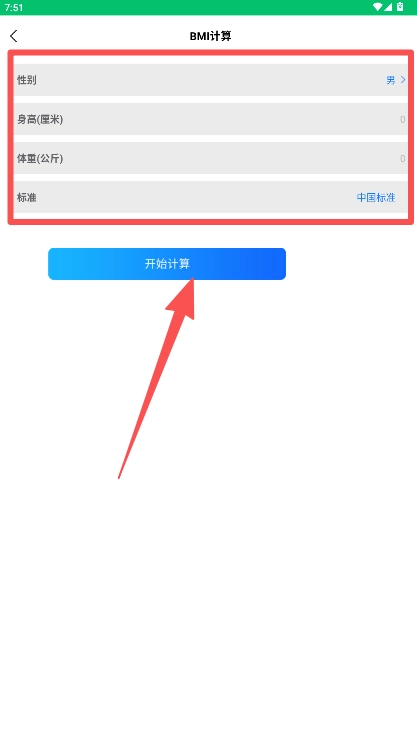 在计算页面输入身高与体重的数据,接着点击“开始计算”按钮,即可得到相应结果。