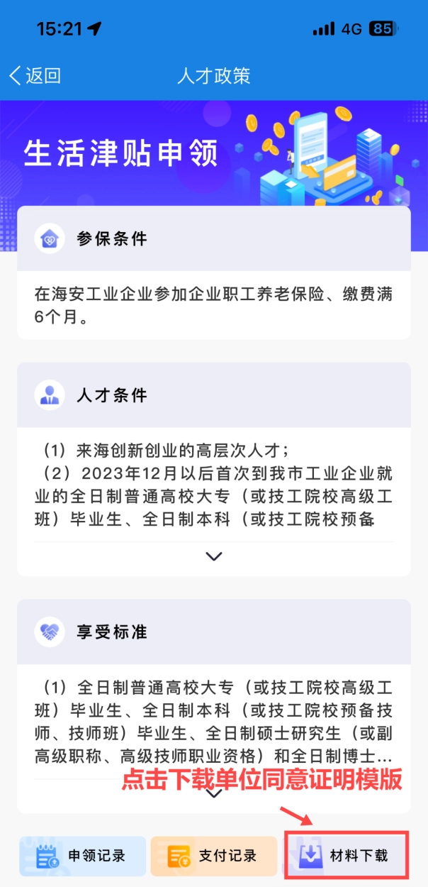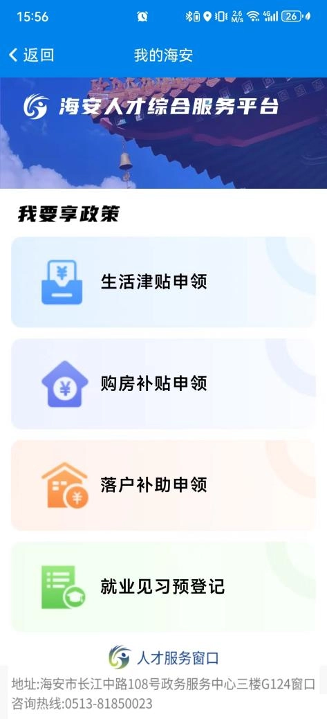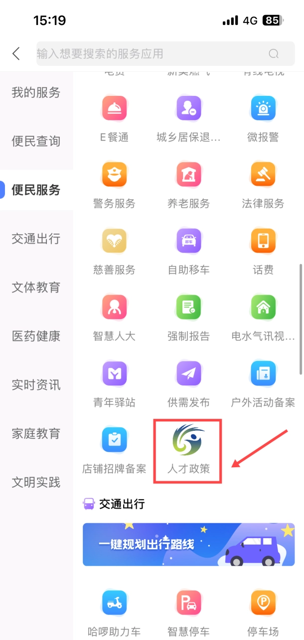 点击“更多”选项,在便民服务板块里找到“人才政策”的图标,随后进入补贴申报的首页。