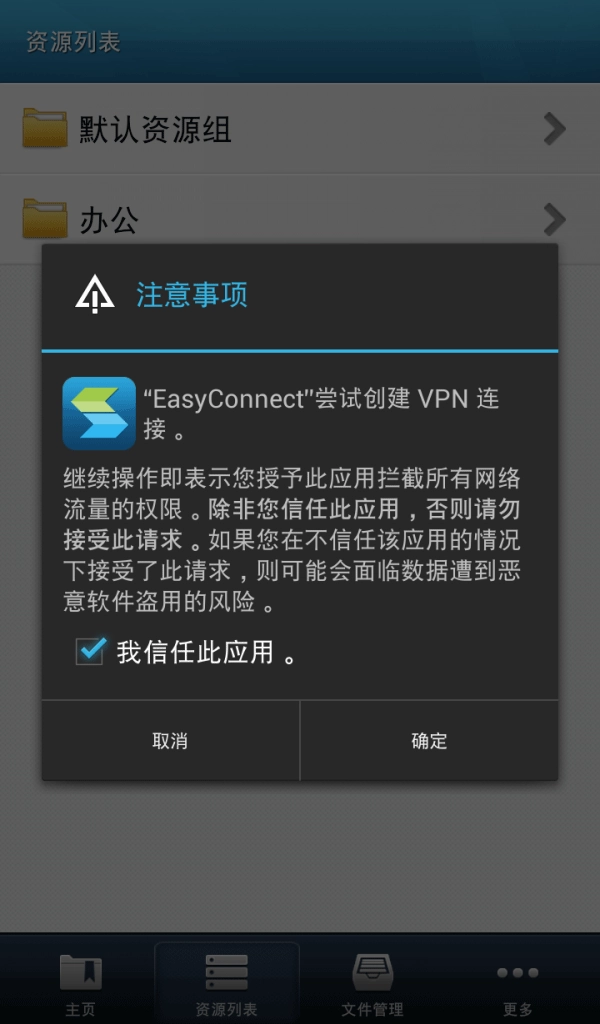 登录成功后,若用户已关联L3VPN资源,EasyConnect客户端会弹出创建连接的提示。此时勾选“我信任此应用”并点击确定,连接建立成功后,系统状态栏会显示相关状态。