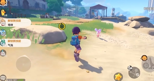 在小镇的沙滩上,记得留意左侧的技能提示,建议优先解锁【弹跳】和【气流】这类技能,它们能帮你更好地探索区域、快速赶路,让行动效率得到提升。