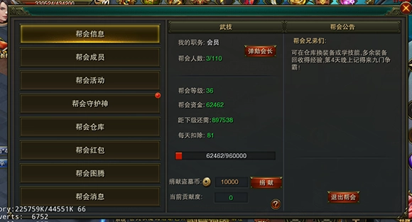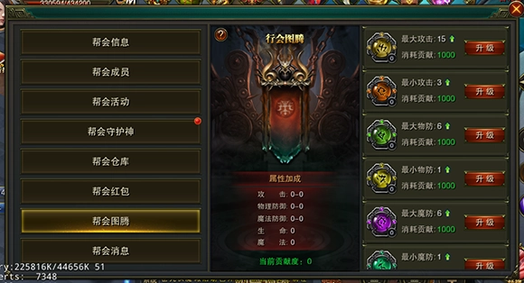 加入帮会之后,能够看到帮会信息界面,在此可以进行帮会捐献以及帮会升级等操作;帮会的等级越高,帮会图腾的等级上限也就越高。