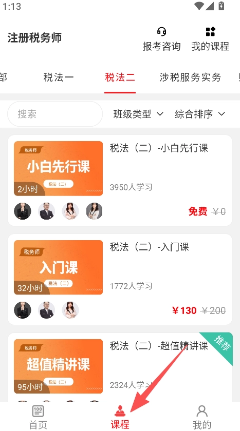 进入课程板块后,选取税法二等科目,然后查看与之对应的课程列表。