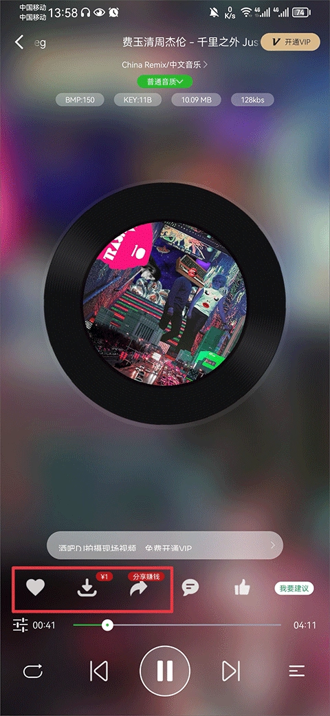 然后就能收听这首音乐了,要是喜欢的话,还能对歌曲进行收藏和分享。