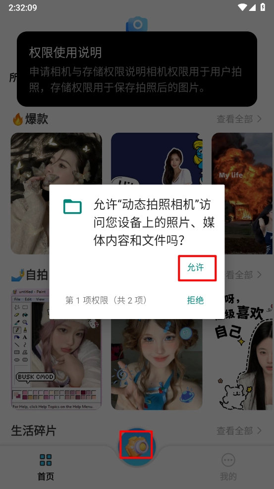 接下来点击相机的中间按钮,允许相关权限访问,进入后就能拍照了。