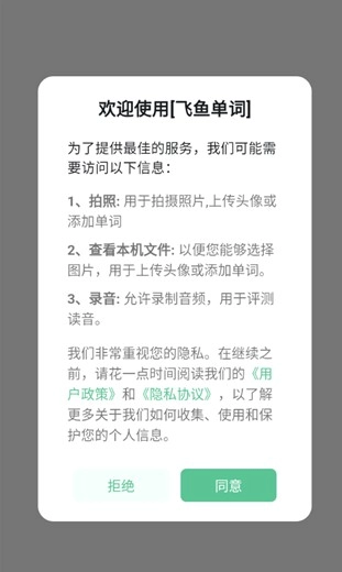 打开飞鱼单词应用,首次使用时需要阅读并同意用户政策与隐私协议,在完成基础权限的确认操作后,即可进入主界面。