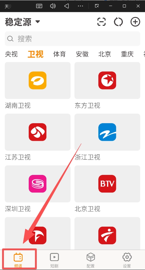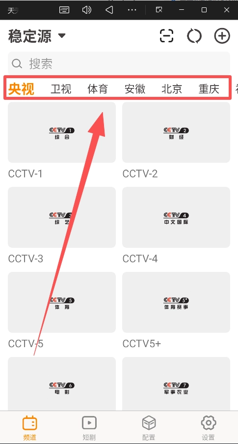 在“稳定源”选项下,挑选你想要观看的频道类别(例如“央视”)。