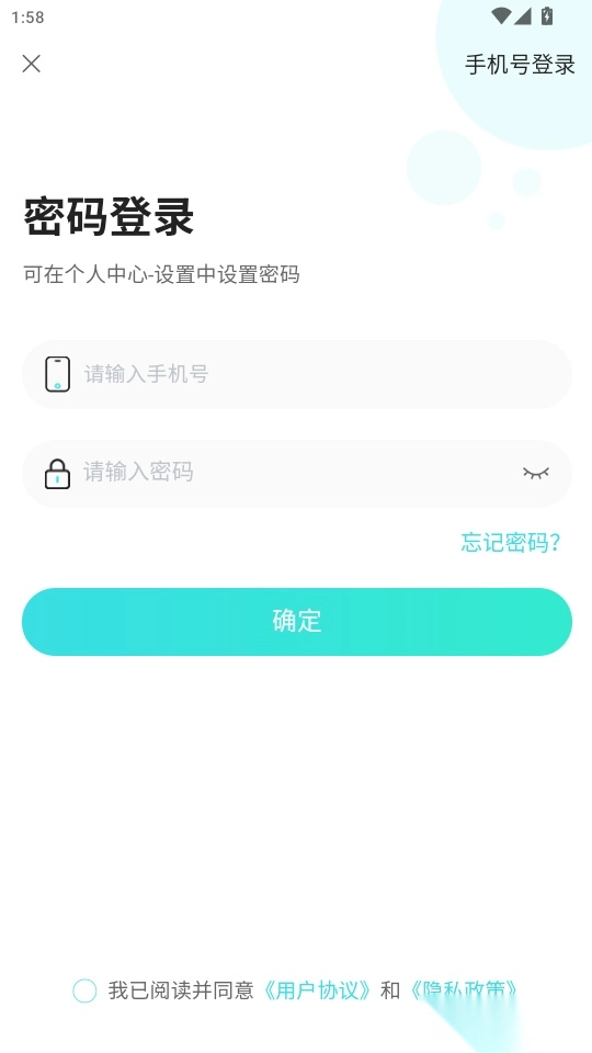 输入手机号、密码点击“确定”即可立即登录使用