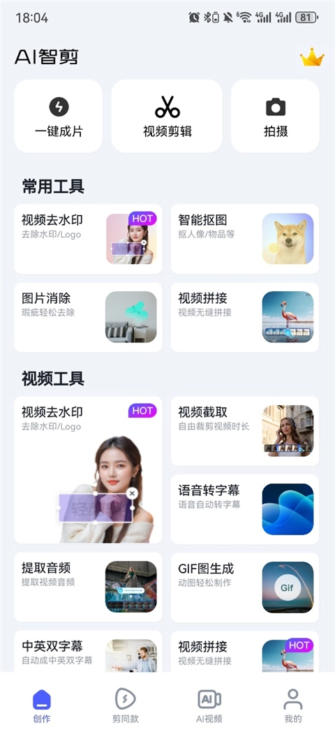 360AI智剪是一款人工智能辅助剪辑工具。借助这款工具,用户可以快速完成视频剪辑并导出成片,它具备自动抠图功能,一键操作即可生成完整视频作品;此外,还支持视频剪辑、图片清晰度提升、视频水印去除、视频片段截取、GIF动图制作、视频字幕消除等实用功能,同时能够调节视频播放速度,也可对有瑕疵的图片进行修复处理。