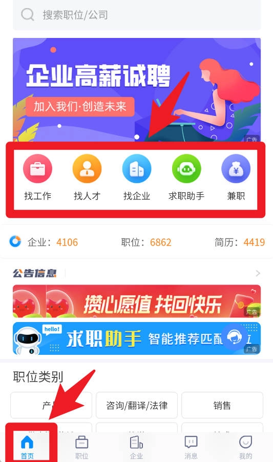 在首页界面,用户可以通过找工作、找企业、求职助手以及兼职等功能入口,全方位满足各类用户在招聘与求职方面的不同需求。