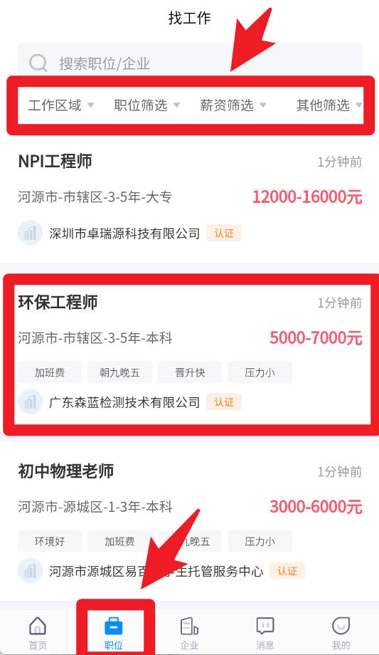 进入职位板块后,你可以借助工作区域、薪资筛选等条件来精准定位合适的岗位,进而快速了解岗位详情并完成简历投递。