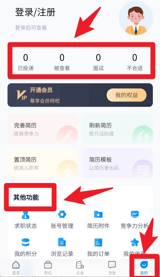 在我的页面,能够查看已投递、面试以及不合适的状态,同时还可以使用简历模板、账号管理、积分和订单等附加功能。