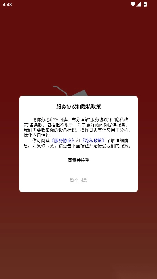 打开软件后,阅读“服务协议和隐私政策”,点击“同意并接受”按钮即可进入。