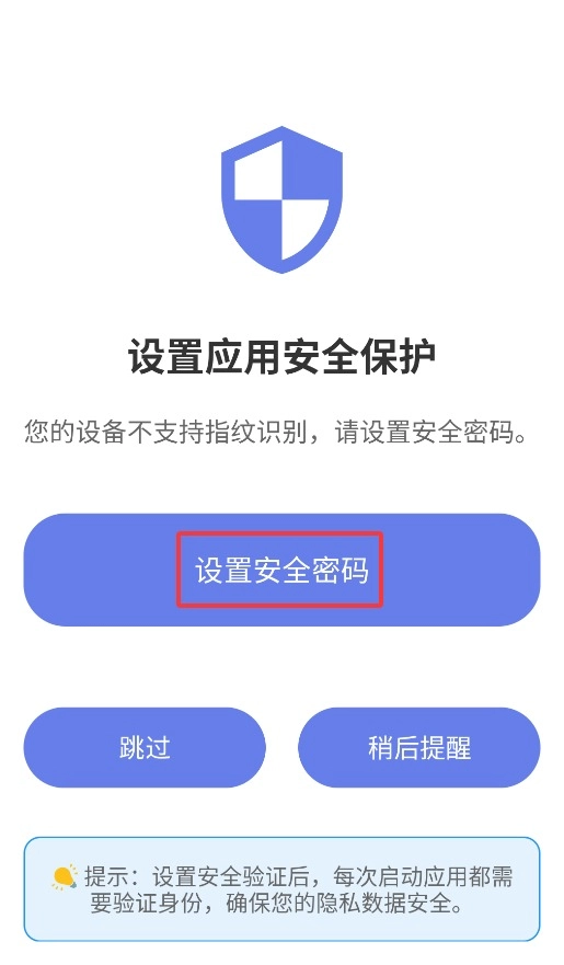 可以设置应用安全密码,每次启动应用时都需要通过密码验证,以此保障隐私数据的安全。