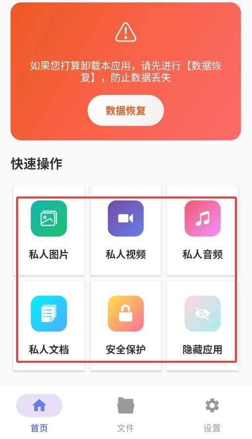 在首页的快速操作区域,能够对私人图片、视频、音频以及文档等加密内容进行管理。