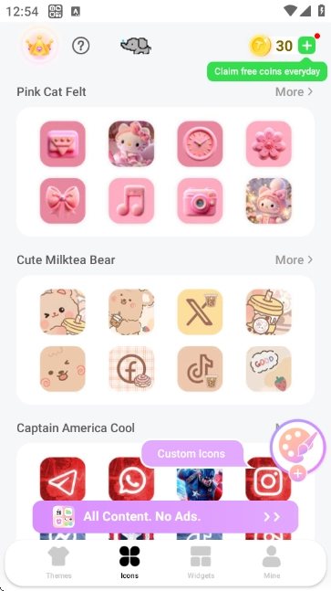 进入“Icons”板块后,你可以挑选各类风格的图标包,像Pink Cat Felt、Cute Milktea Bear这类都有提供,要是想自己设计图标,还能点击“Custom Icons”进行自定义操作。
