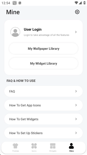 在“Mine”板块,用户能够登录账号,浏览个人的壁纸库与小部件库,同时也可以查看FAQ以及使用教程,例如如何获取应用图标、小部件等内容。