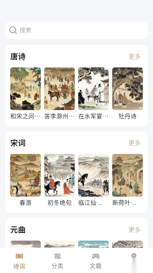 支持用户对所需诗词进行智能分类检索,还能通过输入关键词实现快速精准查找,让搜索过程更便捷高效。