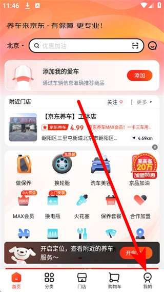打开京东养车应用后,找到底部导航栏中的“我的”选项并点击,即可进入个人中心页面。