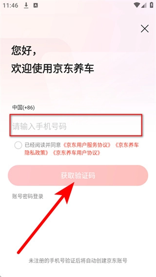在登录界面的手机号码输入框中填写手机号,勾选对应的相关协议后,点击“获取验证码”按钮。