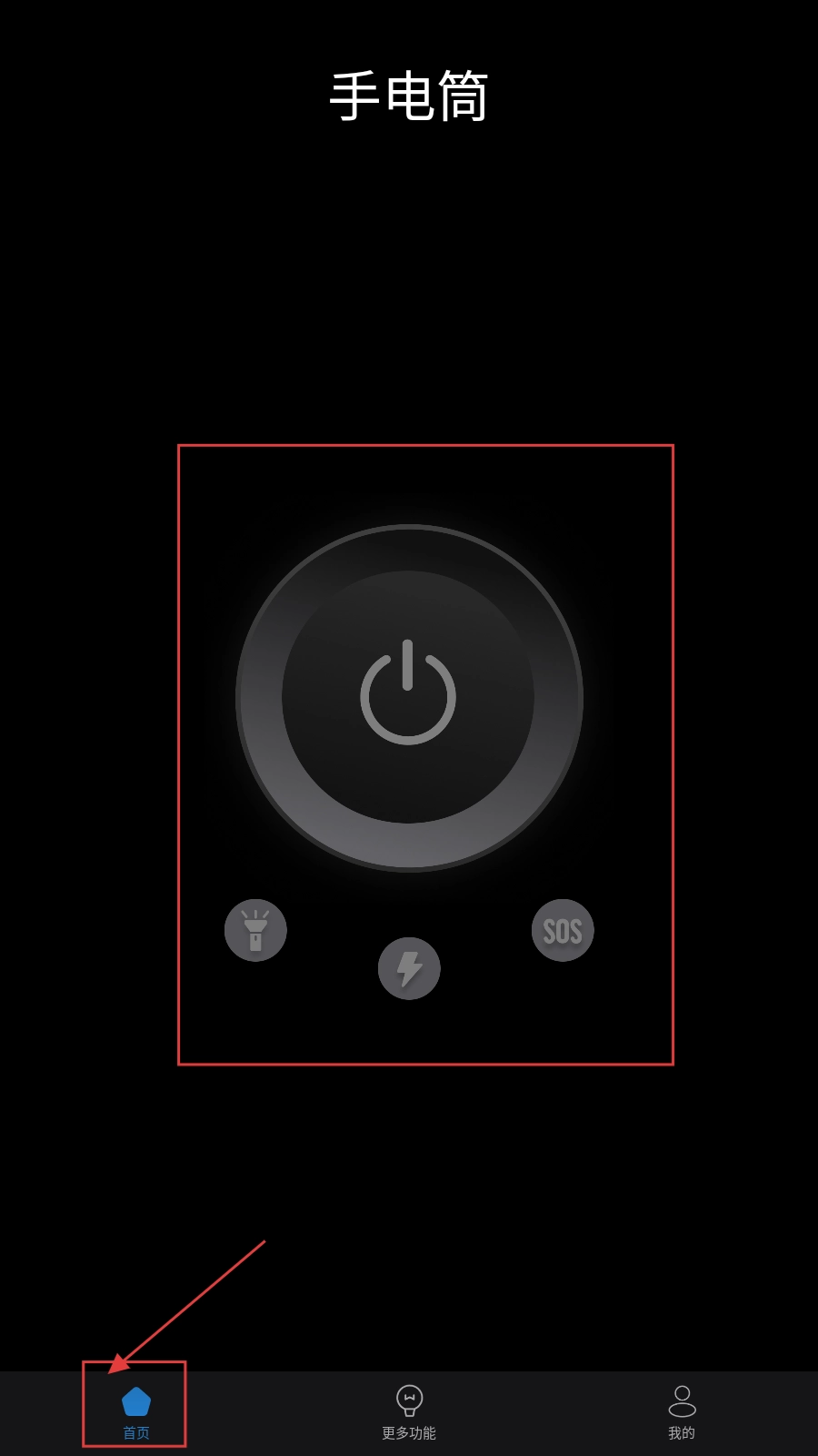 打开手电筒应用后,点击底部的【首页】按钮,就能进入手电筒的主界面。在主界面中,点击中间的电源键可以开启或关闭手电筒,同时也能根据需要选择下方的【SOS】等功能按键。