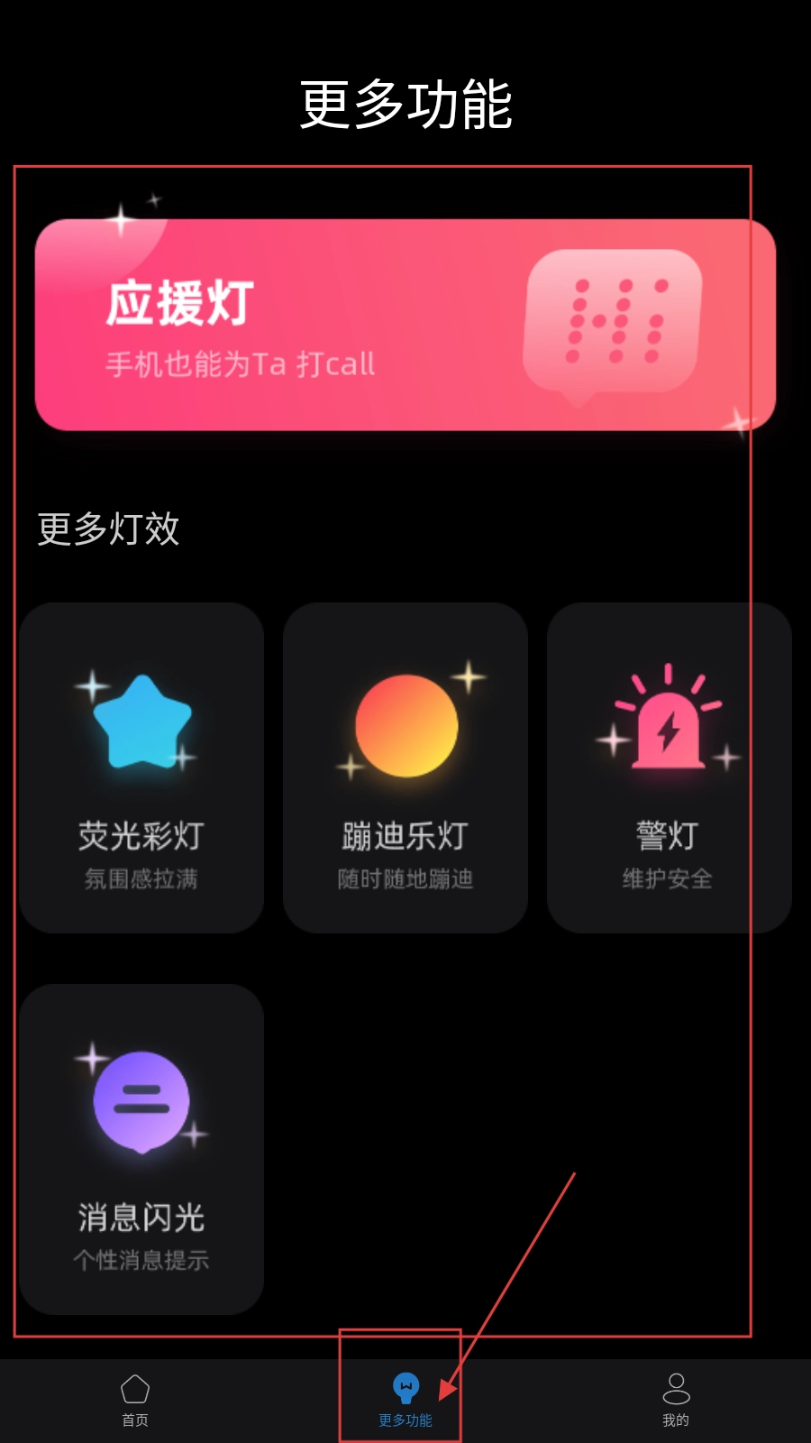 点击底部的【更多功能】按钮,进入更多功能界面后,可选择【应援灯】之类的功能,也能点击【荧光彩灯】等更多灯效来进行设置。