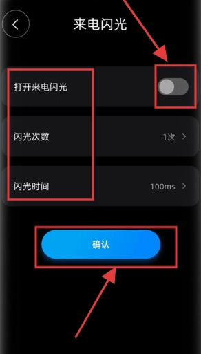 我们以来电闪光设置为例,操作步骤如下:先点击【打开来电闪光】的开关,接着设置【闪光次数】与【闪光时间】,最后点击【确认】按钮来保存这些设置。