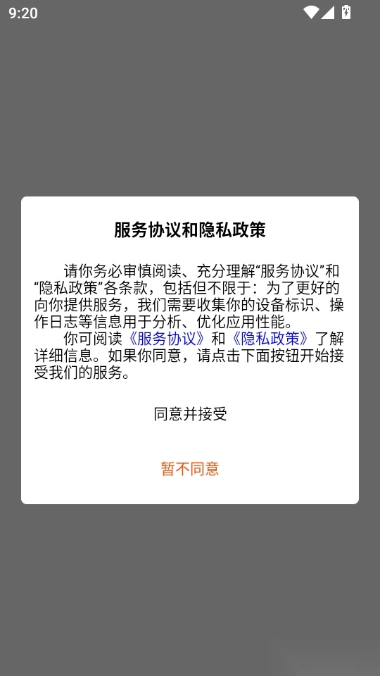 首先打开软件,仔细阅读协议与隐私政策,随后点击“同意并接受”按钮即可进入。