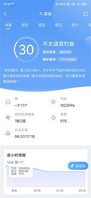 24小时天气预报:页面设计精简,当日天气变化趋势可随时便捷查阅。