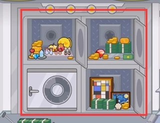 走到银行的二楼,打开保险柜后,按照对应的图形找到钻石、红心、星星和贝壳,再把它们依次放进去,保险柜就能打开了,里面藏着不少宝物。
