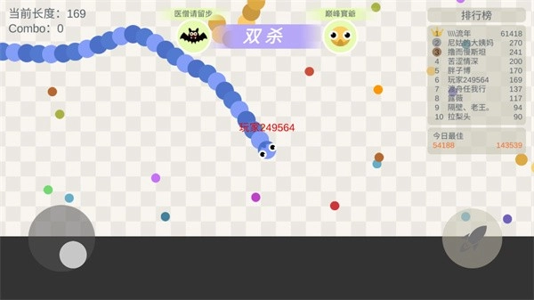 混战阶段:当所有蛇蛇都长到一定长度后,就会进入互相攻击的状态。这时候紧跟在排名第一的蛇蛇后面,往往能捡到不少“肉”。我们不用把目标放在击杀第一名上,那些被其他蛇夹击的“倒霉蛋”才是更好的选择,击杀它们能获得更多能量。一旦发现有可乘之机,就要果断加速冲上去将其拿下。