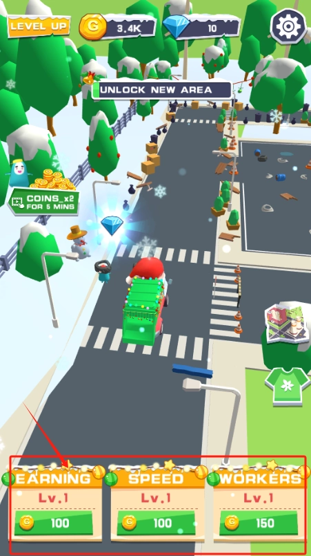 驾驶绿色卡车收集垃圾,提升工人等级和工作速度可以获取更多金币,积累足够金币后就能解锁新的地图。