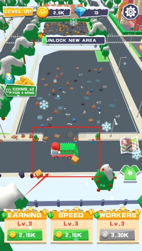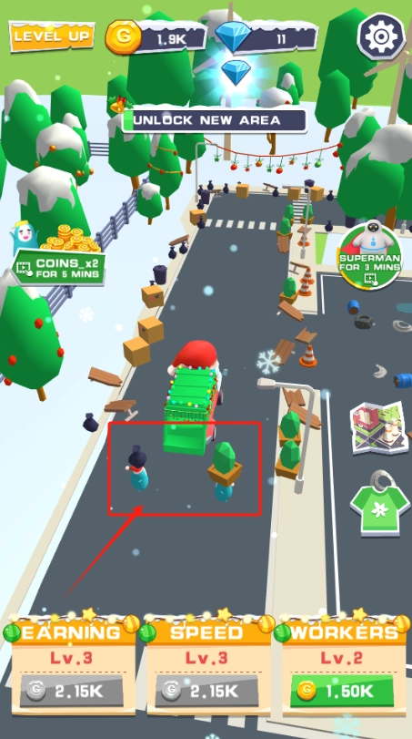 圣诞老人的卡车正在运作,目前收益和速度都已提升至3级,工人的等级还差一级就能满级了。