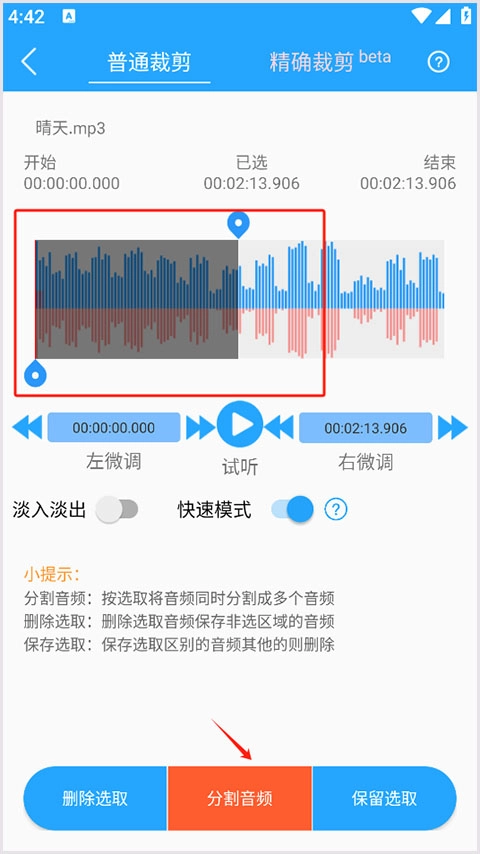 在界面上方选中你想保留的音频片段,接着点击“裁剪”按钮,这样就能完成片段截取了。