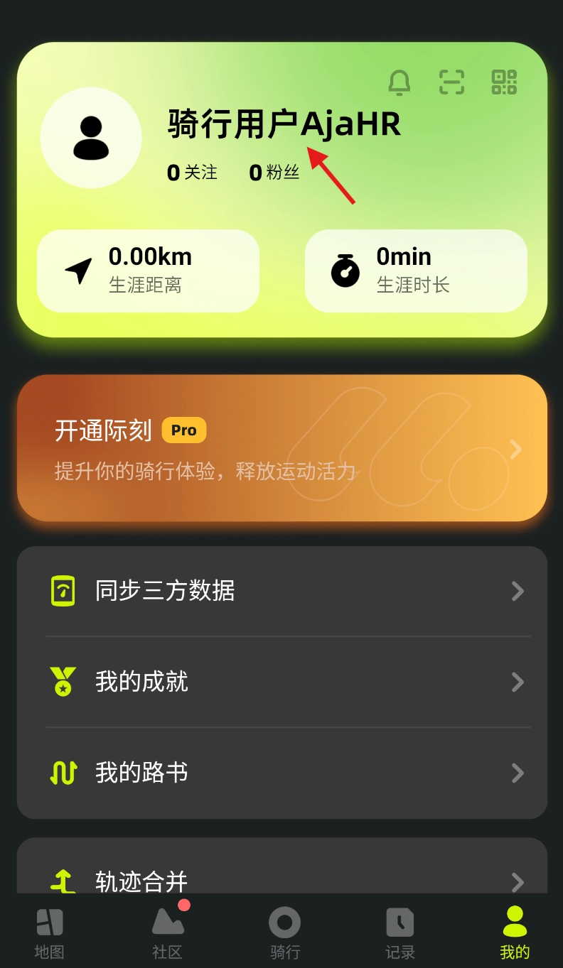 打开际刻骑行,进入地图页面后,找到右下角的“我的”选项并点击,即可跳转至个人界面。