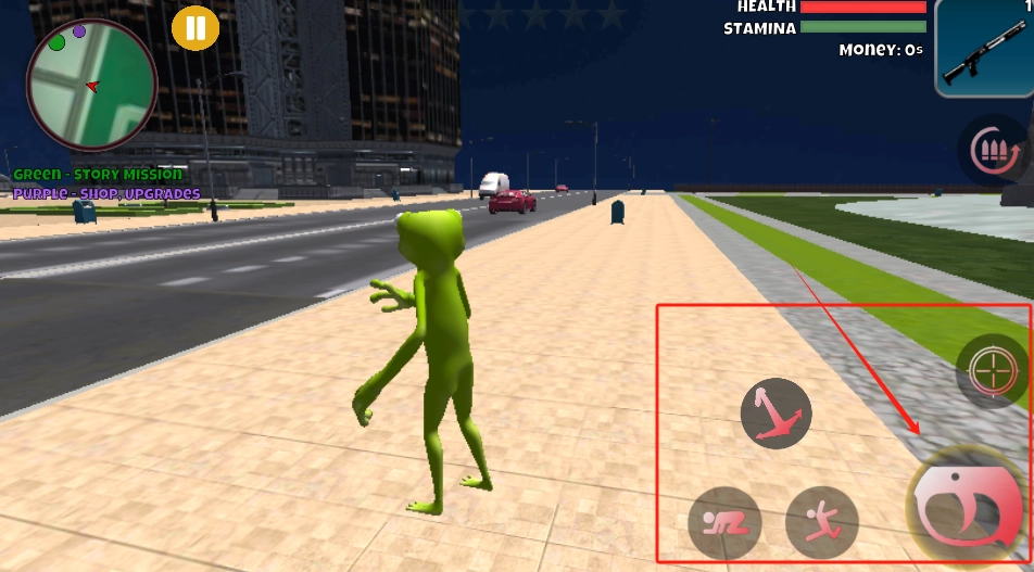 你需要操控绿色小人进行移动,同时利用右下角红框内的爪子按钮来抓取各类物品。