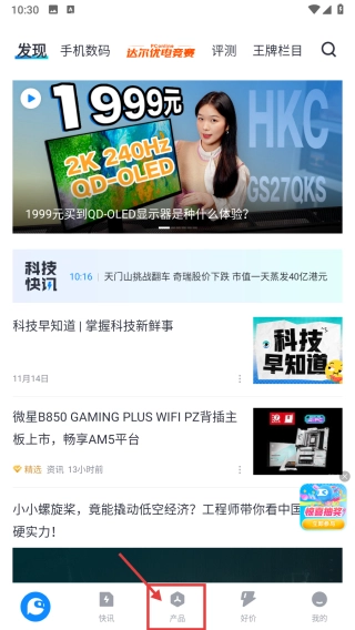 打开科技资讯类内容,点击底部的产品选项,即可进入产品分类页面。
