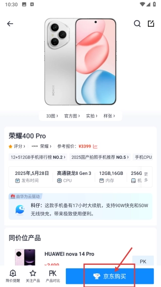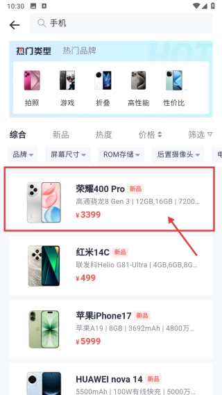 在手机产品列表中,找到荣耀400-Pro这一项并点击,即可进入该产品的详情页面。