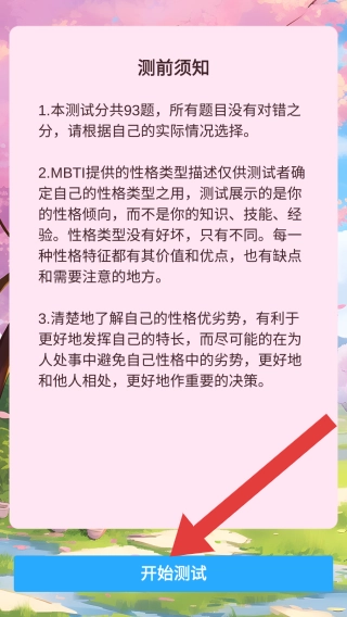 测试共93题,无对错之分,MBTI测试呈现性格倾向,性格类型无好坏,了解性格优劣势利于个人发展,点击开始测试按钮。
