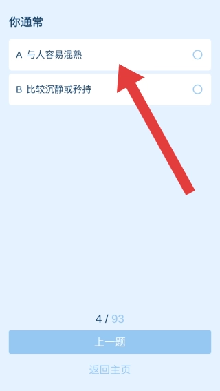 题目为你通常,选项A与人容易混熟、B比较沉静或矜持,这是第4/93题,设有上一题按钮和返回主页按钮。